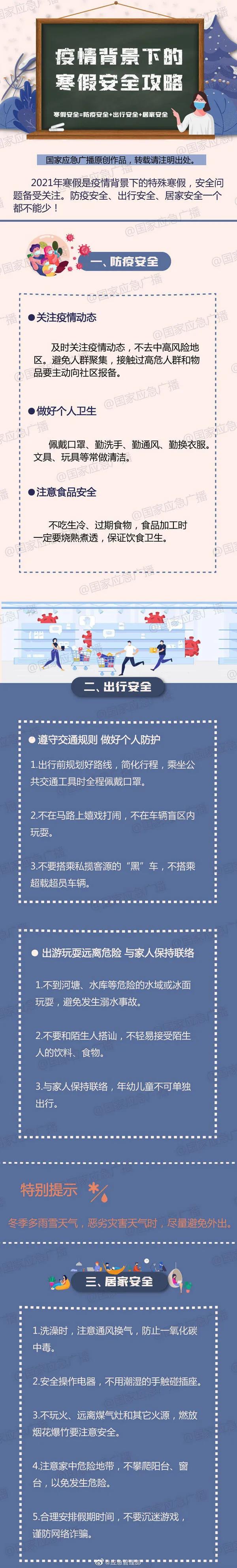 2021年寒假是疫情背景下的特殊寒假,安全問(wèn)題備受關(guān)注。防疫安全、出行安全、居家安全一個(gè)都不能少!戳下圖了解↓不讓安全放假。