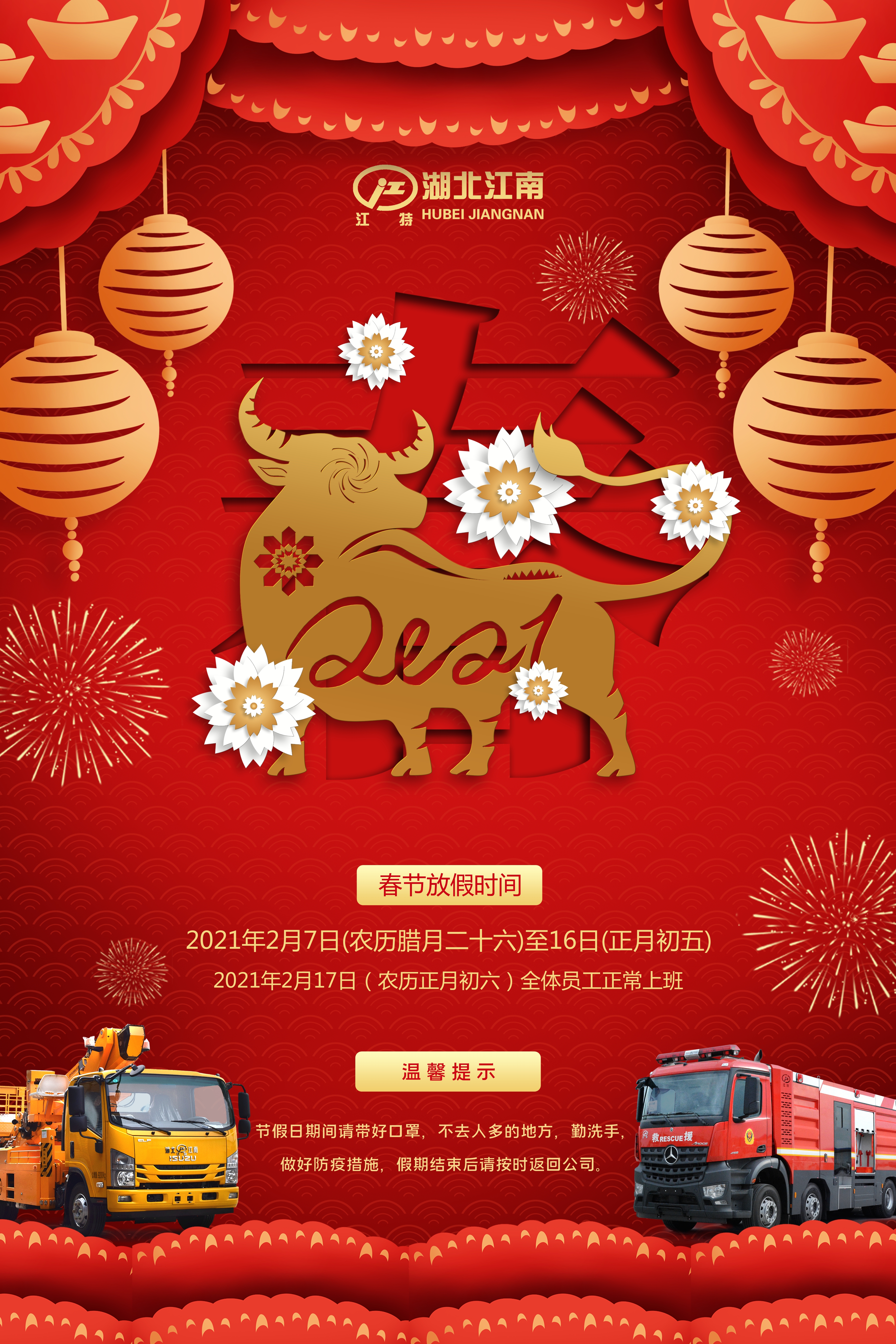 值此新春佳節(jié)來臨之際,湖北江南專用特種汽車有限公司攜全體員工恭祝大家新春愉快,財(cái)源廣進(jìn),事業(yè)紅火!